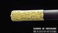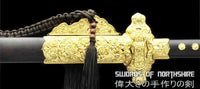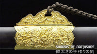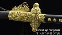- Hand-finished, three-dimensional carved dragon, seven stars, sun and moon engraved into the blade